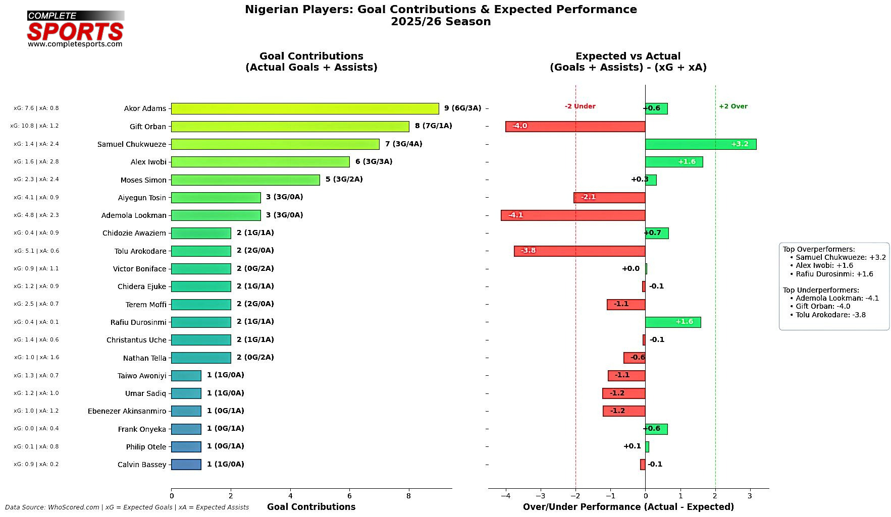 Alors que les cinq grands championnats européens entrent dans le virage décisif de la saison 2025-2026, la performance des internationaux nigérians fait l’objet d’une attention particulière. Au-delà des compilations vidéo et des impressions visuelles, notre source *Complete Sports* a mené une analyse approfondie des données brutes pour distinguer la perception de la réalité statistique. Une plongée dans les chiffres qui redessine la hiérarchie offensive des Super Eagles.