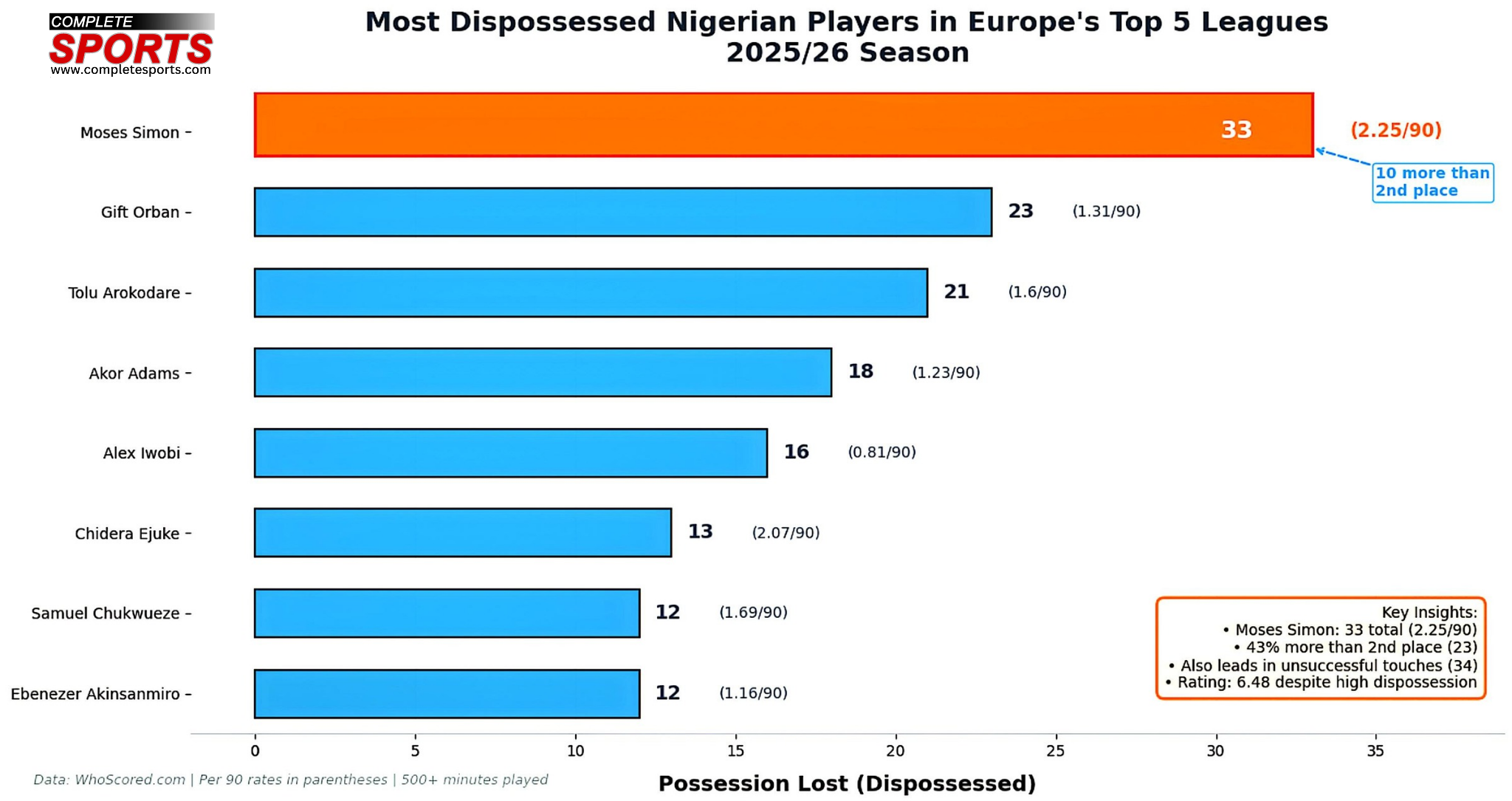 L’attaquant des Colchoneros affiche une contribution omni-présente : tirs, dribbles et création d’occasions. Le rapport souligne qu’aucun autre Nigérian n’a vu autant de tirs contrés, signe d’une activité constante au cœur des défenses adverses, bien au-delà de la simple finition.